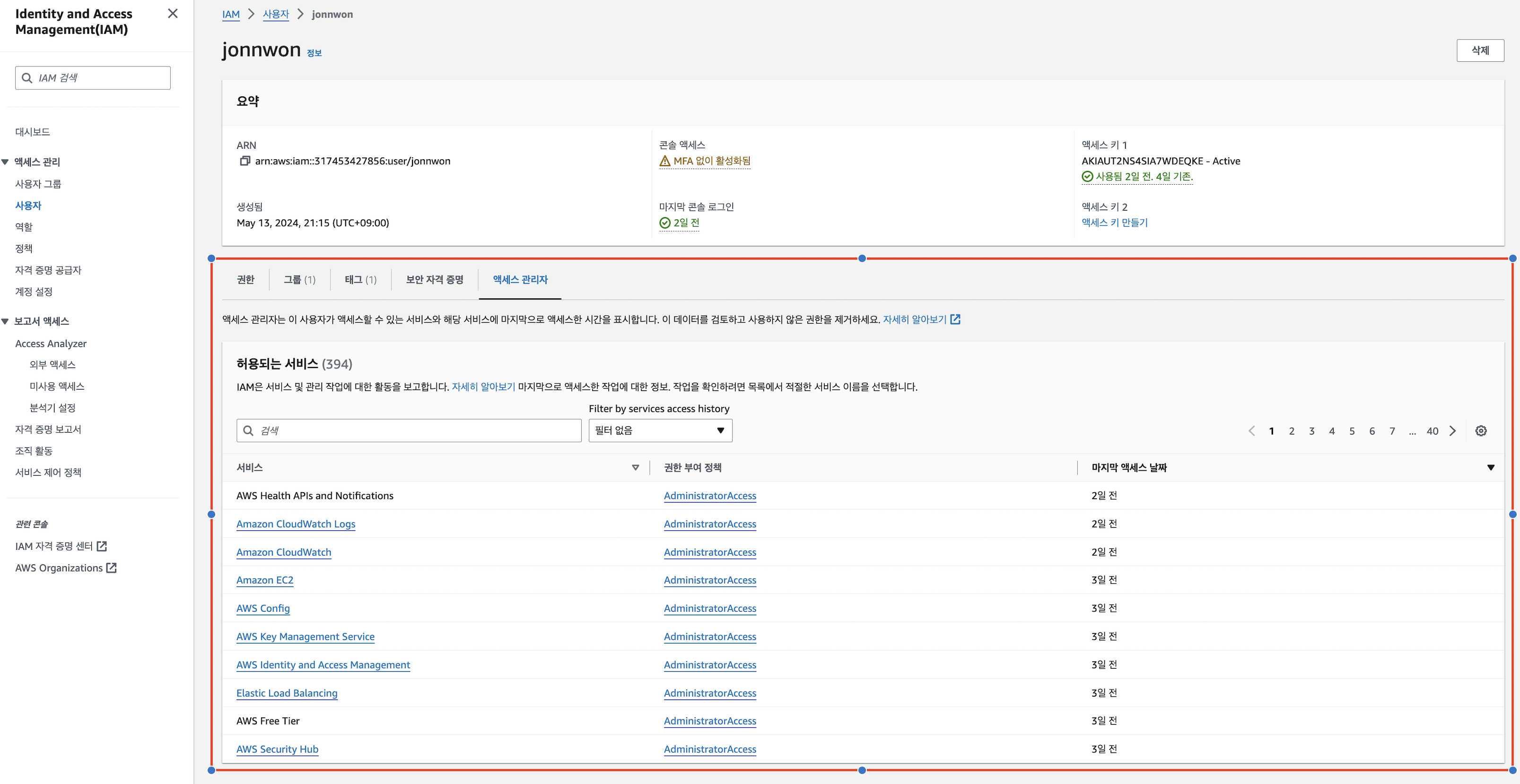 - 액세스 키 정보: 액세스 키 생성 여부, 마지막 사용 시간, 그리고 관련 자격 증명 정보를 확인할 수 있다.
