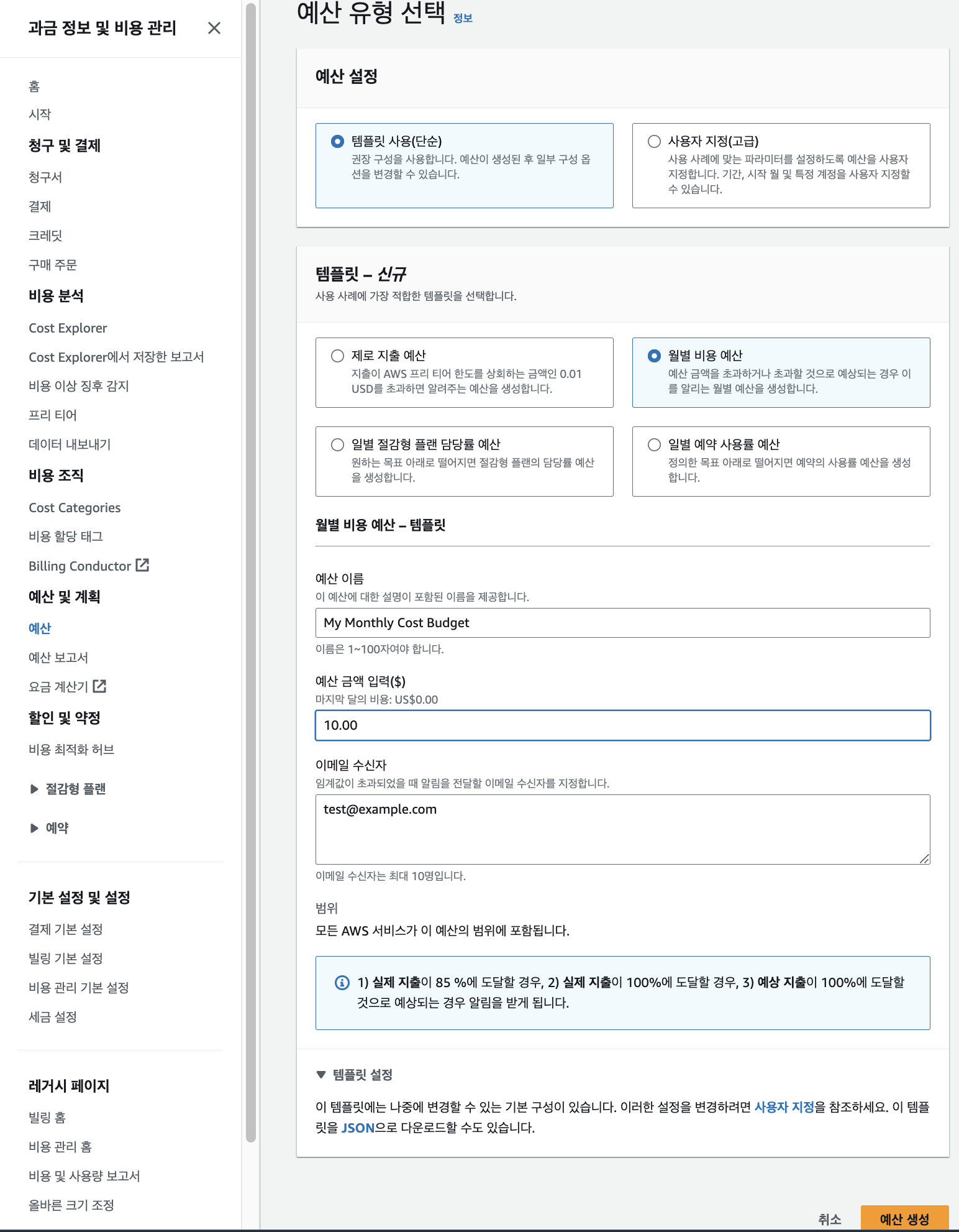 - 월간 비용 예산: 월간 비용 한도를 설정하여 특정 금액을 초과할 경우 알림을 받도록 한다. 예를 들어, $10 이상의 비용이 발생할 경우 알림을 받도록 설정한다.