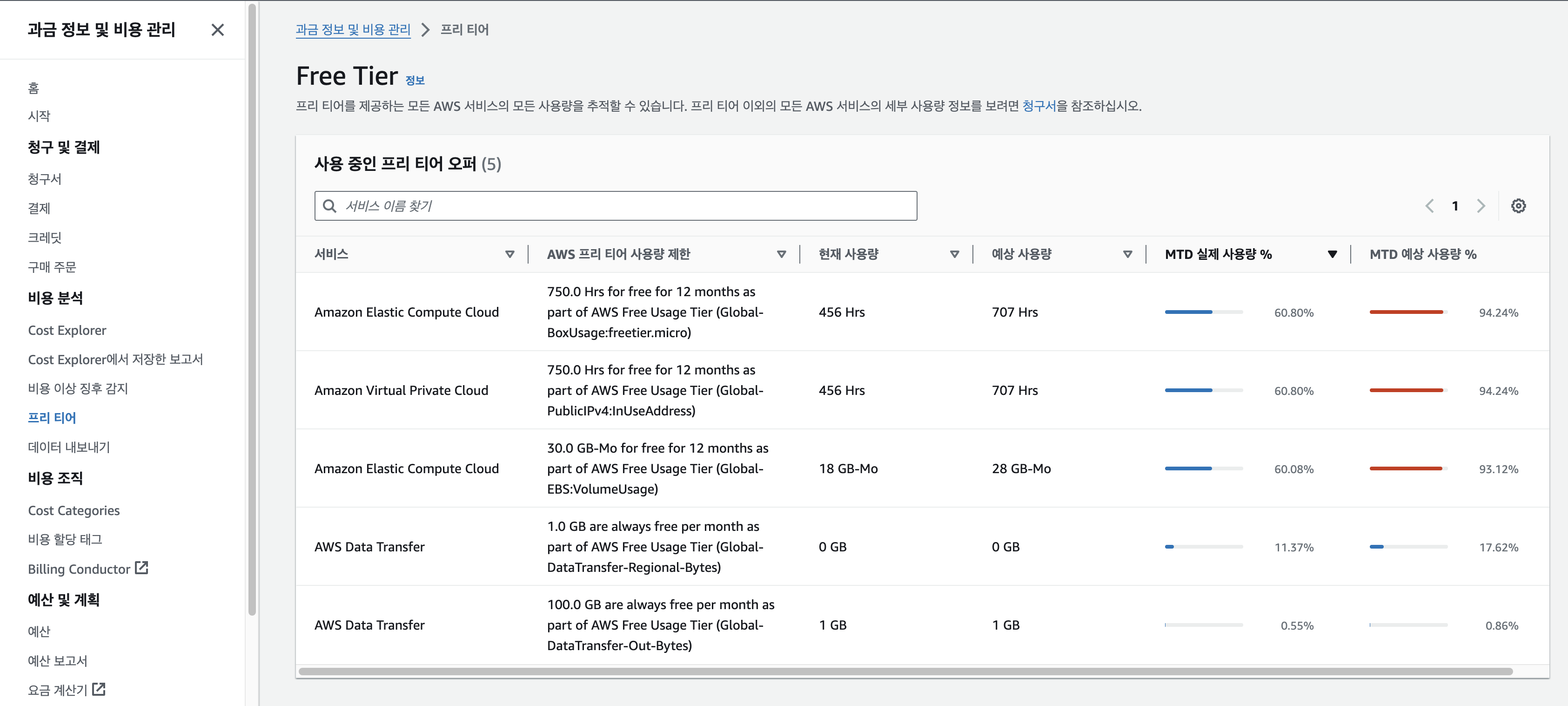 - 무료 등급 사용량 확인: 비용 분석 탭의 '프리티어'에서 무료 등급(프리티어) 사용량을 확인하여 현재 사용량과 남은 사용량을 파악한다.