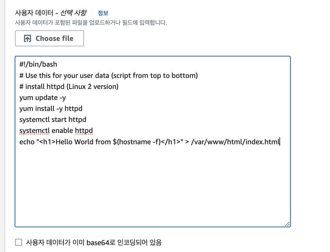 • 사용자 데이터 추가: 인스턴스 부팅 시 실행할 사용자 데이터 스크립트를 추가