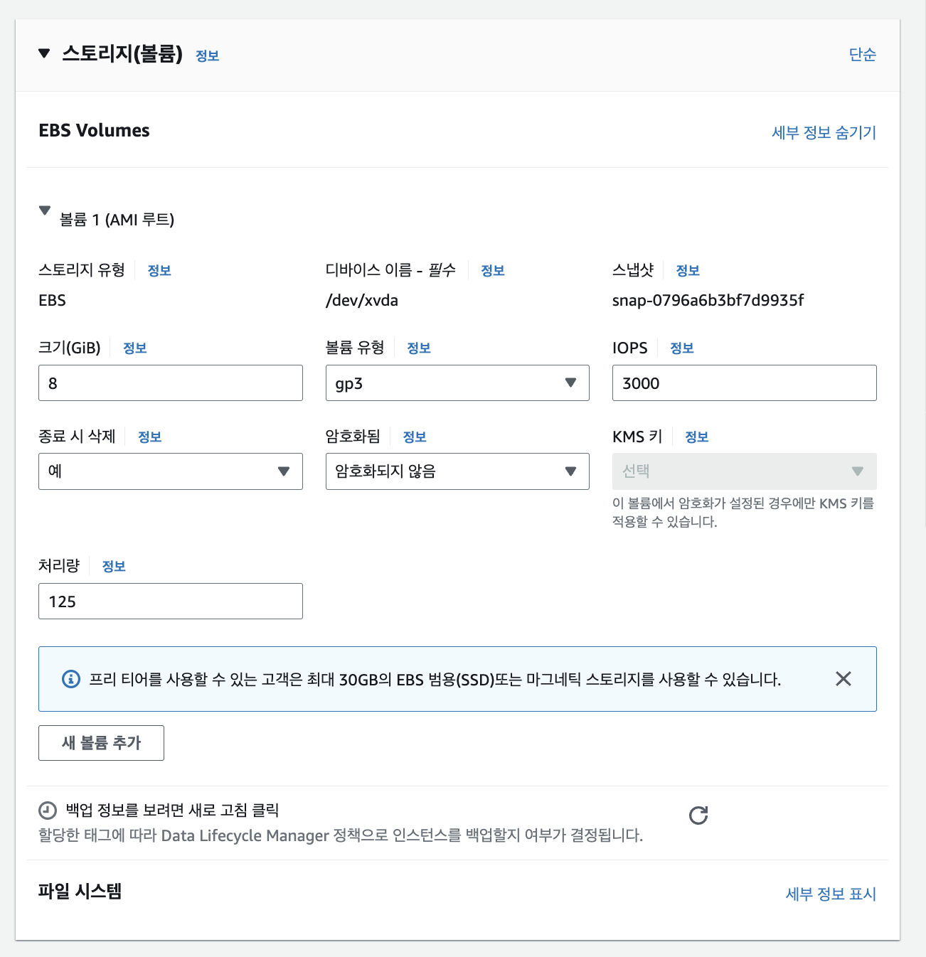 • 기본 설정인 8GB의 EBS 볼륨을 유지