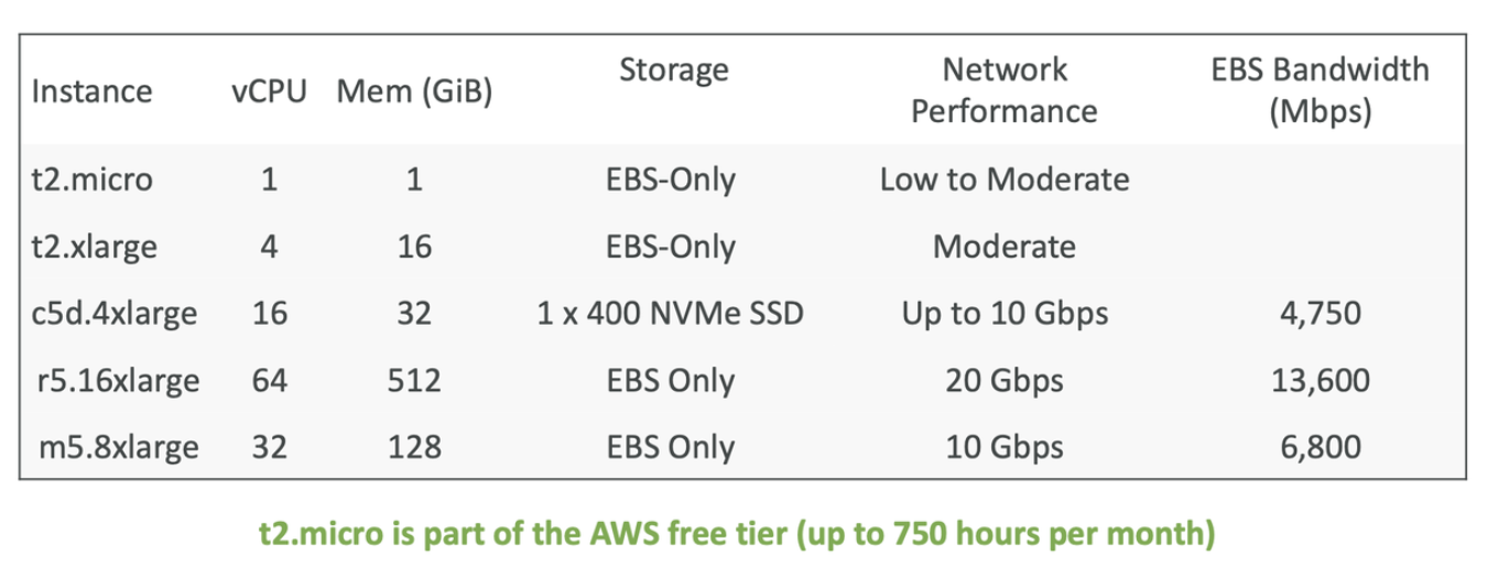 - 예시: i3.large (vCPU 2개, 메모리 15.25GB, NVMe SSD), d2.8xlarge (vCPU 36개, 메모리 244GB, HDD).