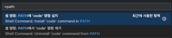 vscode를 키고 command+shift+p 를 하여 명령제거, 명령 설치를 해줘야 했다.