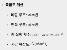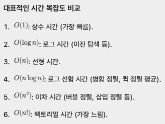 • 시간 복잡도(Time Complexity): 알고리즘이 실행되는 데 걸리는 시간을 나타내는 개념.