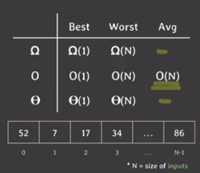 Avg는 보통 N/2로 계산함. 오메가로 표현하긴 애매하다. 확실한 Big-O 표기법으로만 표현