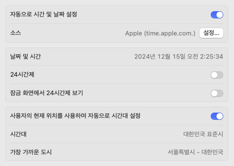 시스템 환경설정 -> 일반 -> 날짜 및 시간