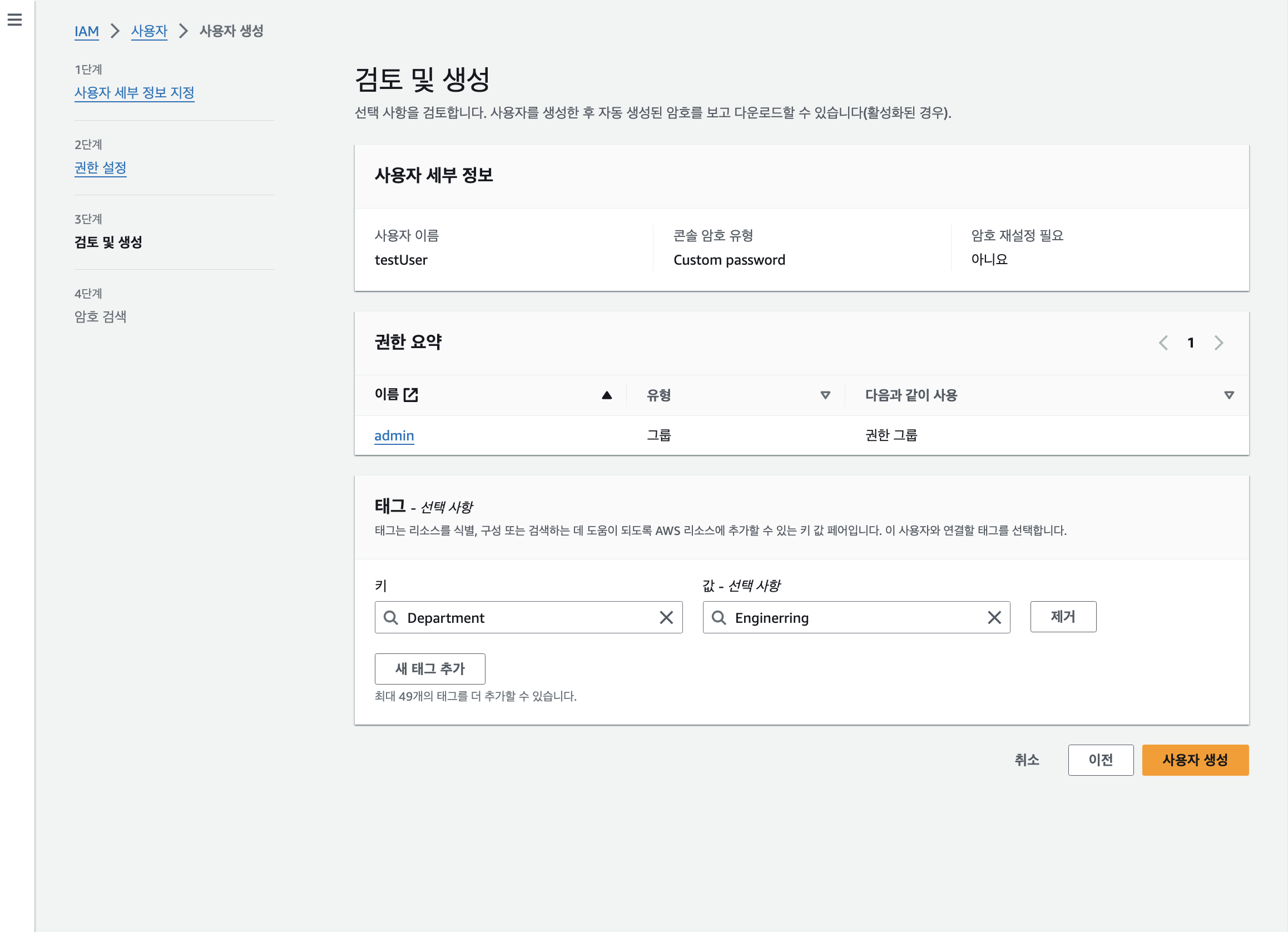 - 사용자 이름, 그룹 권한, 태그 확인 (태그에는 부서 등을 추가할 수 있음)