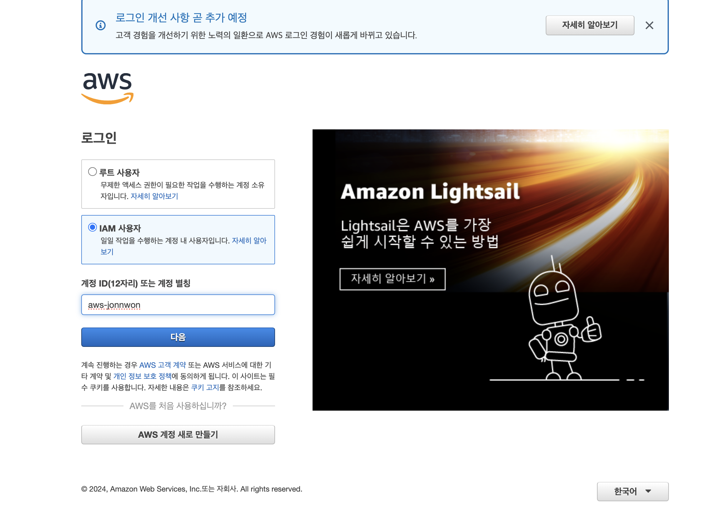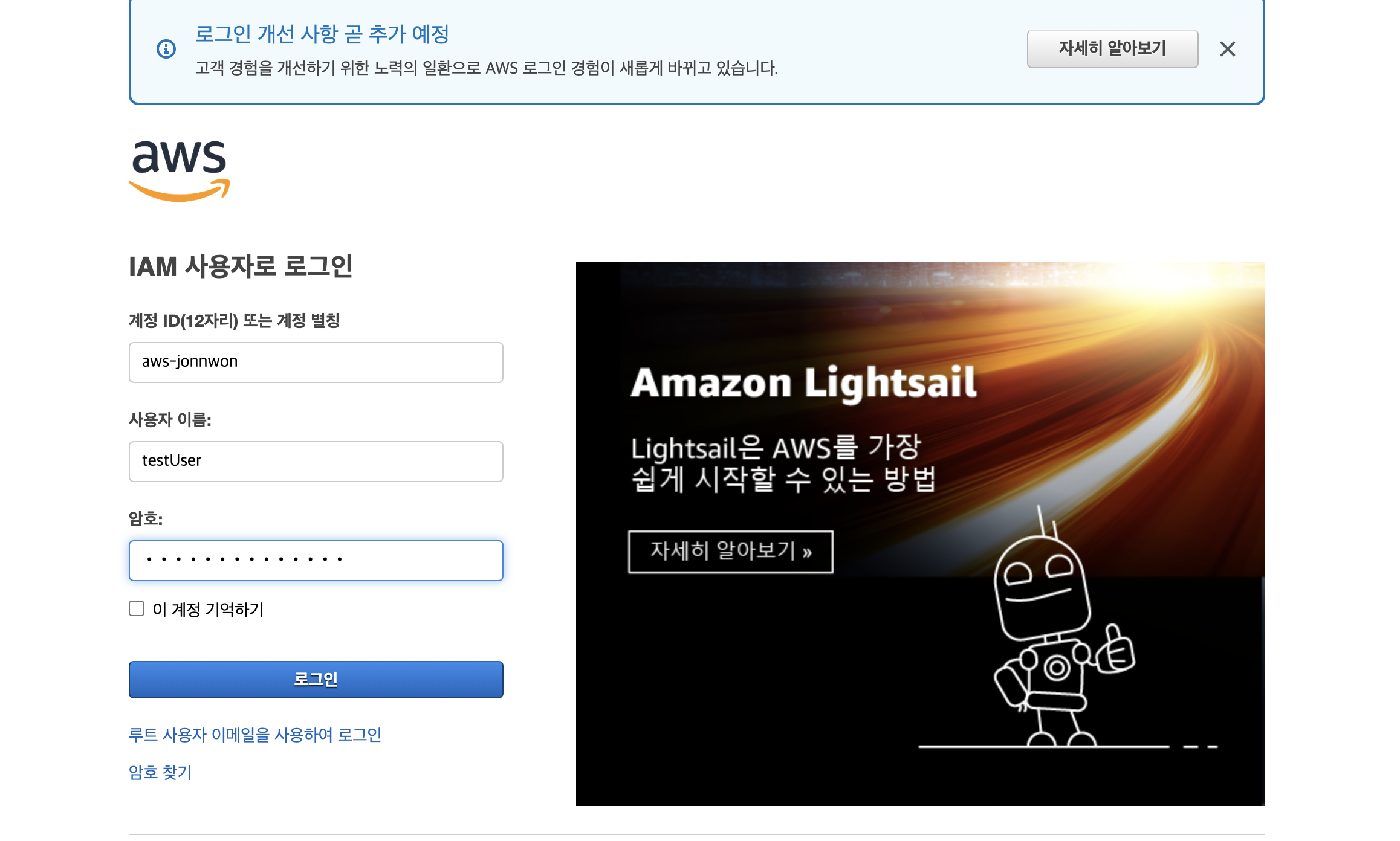 - 계정 ID 또는 계정 별칭을 입력하여 IAM 사용자로 로그인