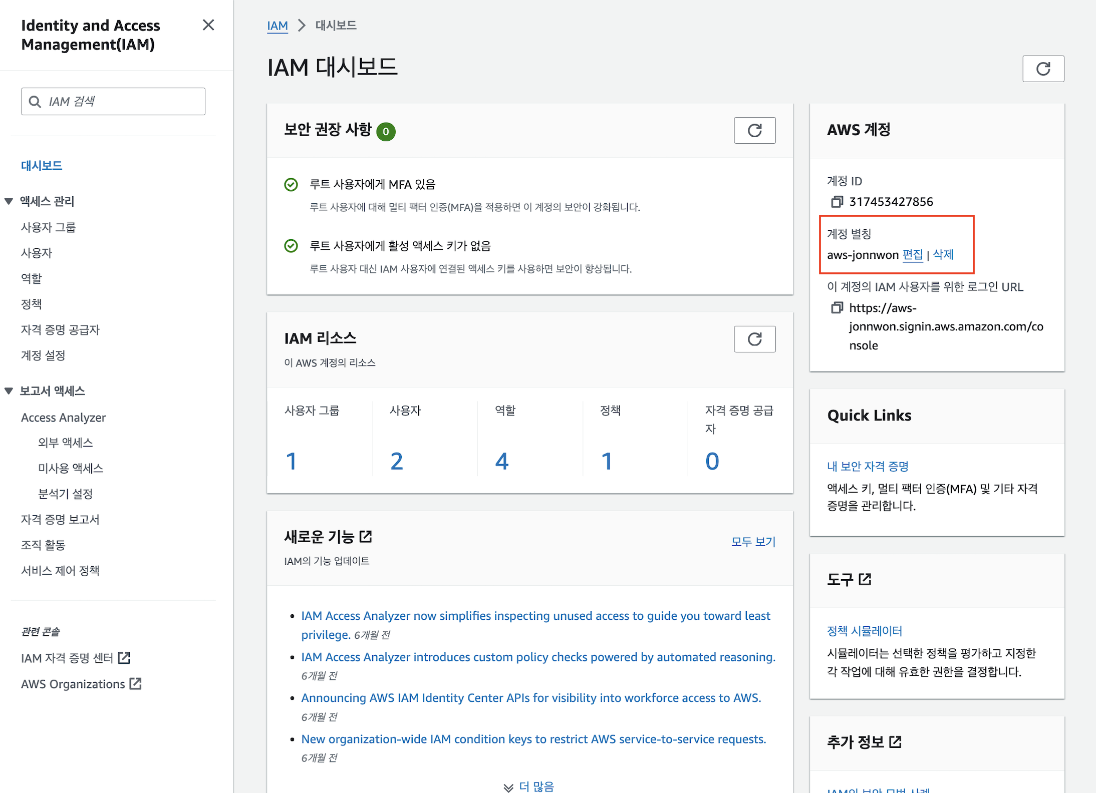 - 계정 별칭을 만들어 로그인 URL 간소화 가능