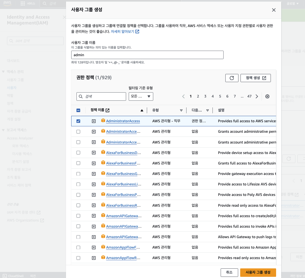 - 그룹 이름은 admin, 정책 이름은 Administrator Access로 설정