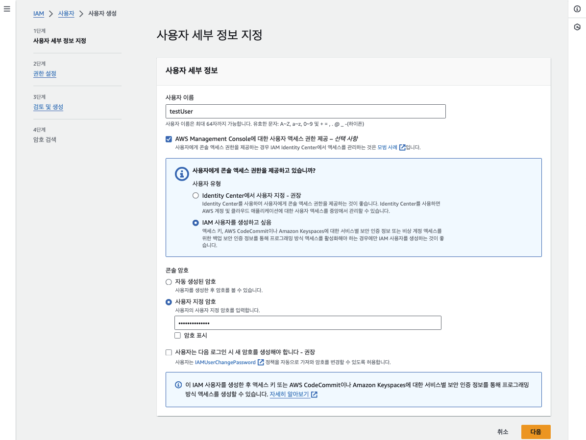 - 관리 콘솔에 접근할 수 있게 하기 위해 IAM 사용자 생성 방법 선택