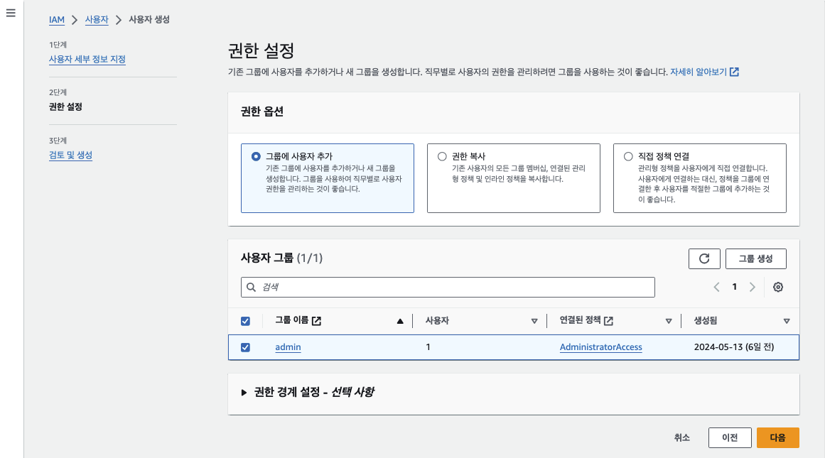 - 그룹을 생성하여 권한 부여하는 방법 선택